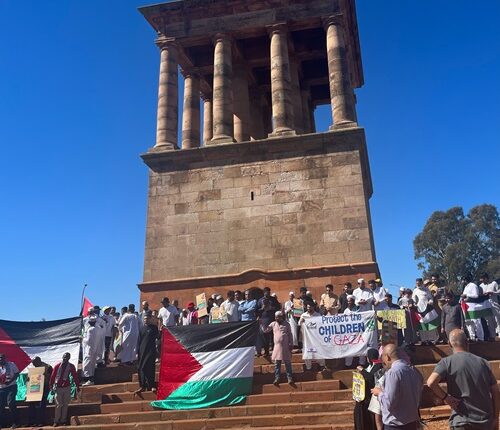 Following the massacre of Palestinians in the Middle East by Israel last week members of the “Africa for Palestine Solidarity Network “in Kimberley gathered at the ‘Honoured Dead Memorial’ monument for a solidarity rally last Friday.